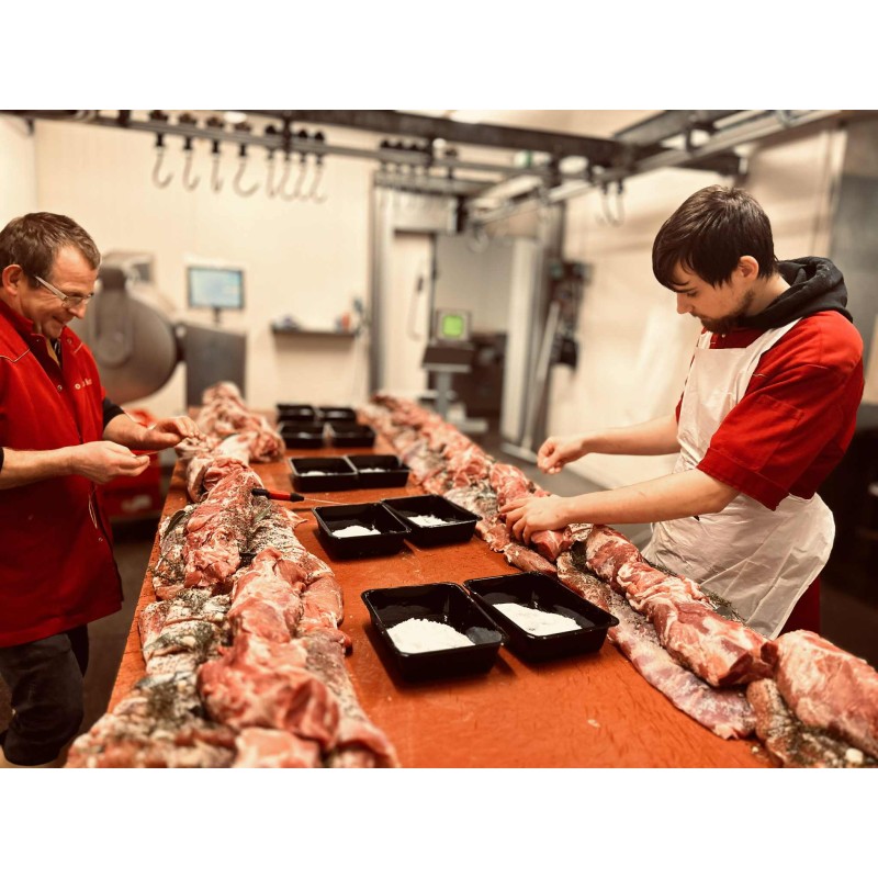 La pancetta, un lard roulé avec du spiringue puis salé, minutieusement assaisonné.
